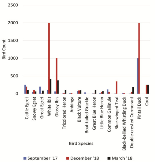 Uric acid was quantified in the excreta from reptiles (Alligator mississippiensis, collected from site 8×), largemouth bass (Micropterus salmoides, collected from site 18C), and avian guano (unknown species, scraped from leaves in the cypress dome). The uric acid composition of each was found to be 0.439%, 0.972%, and 5.5% by dry mass, respectively. Given these percentages, the avian excreta in particular seem likely contributors to the uric acid added to the wetland. To assess the likelihood waterfowl increasing the uric acid, two avian specialists volunteered to conduct a ground survey of the birds present in the wetland. Each survey occurred at sunrise when roosting birds leave the cypress dome. The bird counts and identities were estimated by one bird specialist and independently confirmed by a second. The species of birds present and their estimated numbers are shown in Figure 6.