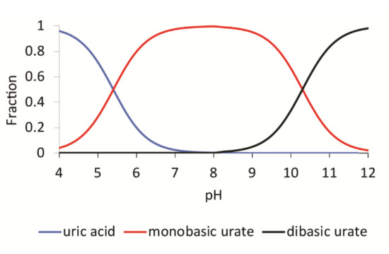 Fraction of uric acid and urate salts as a function of pH.