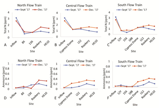 Concentrations of total nitrogen (A–C) and ammonia (D–F) along the three flow trains of the wetland. The site designations occur in order from inflow to outfall (HS10) and other labels can be correlated with sites in the map in Figure 2.