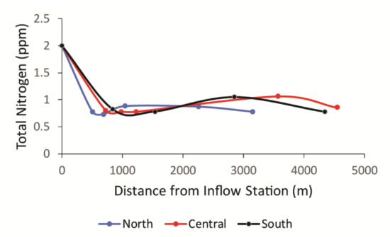 The north and south flow train (Figure 8, graphs A and C) show an initial decline in the total N through the first cells of the deep marsh, populated with bulrush sedge and cattail plants. This initial decline is not observed in the central flow path (Figure 8, graph B) because the samples were not collected near the site of the deep marsh but sampled the inflow and cypress dome and later sites. As the water traverses the cypress dome and rookery, where more birds are expected to be present, the total nitrogen concentrations are higher than at the deep marsh sampling sites (8X, 12Y, 15X, 18B, Figure 2). The ammonia concentrations at those sites are higher than the inflow concentrations for all flow paths. This increase in ammonia and total nitrogen indicates the contribution of additional nutrients to the water from the wildlife, and the increasing ammonia in particular, is consistent with the microbial degradation of uric acid that is added to the water beyond the deep marsh. Although the nitrogen was only measured for two of the sample collection days, over thirty years of data concerning the total nitrogen entering and exiting the OEW are publicly available and are consistent with the sampling data in Figure 8. As an example, the total nitrogen average for the year 2018 is plotted in Figure 9 [25]. These data show a trend of first dramatically decreasing, then slightly increasing total nitrogen content, consistent with those observed during the specific sampling points of this study.