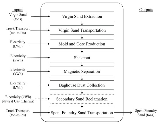 The functional unit chosen for the LCA was one ton of cured molding sand. Other studies such as [4,5] used one ton of finished steel when studying foundry processes, but since this study is focused entirely on the sand-handling train, the cured mold and core sand was selected.