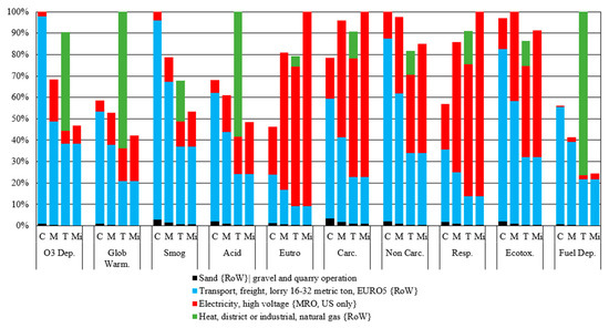 The impact caused by the transportation of sand from the distributor to the foundry and then the foundry to the landfill is the largest single contributor to almost every impact category in the final analysis. This can be easily explained because the distance between the foundry and the sand source, as well as the landfill, is so large. As the sensitivity analysis showed, choosing a closer virgin sand source can drastically reduce the environmental impacts of the entire sand-handling process. As previously stated, at very close distances, the main environmental impact driver is no longer transportation in many cases. When this happens, the additional energy required by the secondary reclamation processes make them perform worse, from a life cycle viewpoint, than the current process, in most impact categories. This extreme case is similar to the system modeled by Yigit [5], and similar results are found in this research.