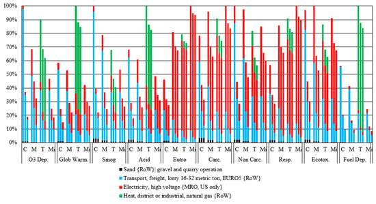 Figure 2 aids in showing which sub-processes are most important in each impact category by normalizing each impact category by the maximum value in that category. The “Sand” sub-process includes all impacts due to the production of virgin sand. The “Transport” sub-process includes impacts caused by transporting both virgin and SFS to and from the foundry. “Electricity” includes all electrical energy inputs for all applicable processes at the foundry. “Heat” is the natural gas requirement unique to the thermal scenario. The resulting graph clearly shows which process has the greatest environmental impact in that category, as well as highlighting the contribution of each sub-process to the total impact. In ozone depletion, global warming, smog, acidification, and fuel depletion, the transportation sub-process causes the greatest portion of the impact and, in some cases, almost the entire impact. For the remaining categories (eutrophication, carcinogenic, non-carcinogenic, respiratory, and ecotoxicity), electricity also plays an important role. Natural gas impacts are shown to be primarily significant in the ozone depletion, global warming, acidification, and fuel depletion categories. The impact caused by sand excavation is negligible compared to the other inputs.