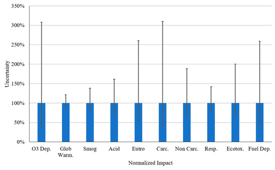 An analysis of the uncertainty of the model parameters is useful for understanding the model results. Uncertainty in this LCA model only considers the uncertainty of the environmental impacts based on the Ecoinvent database in the model. The database is transparent, and all uncertainty values are clearly documented [28]. Uncertainty exists in foreground data, but due to the wide range of data sources, quality, and variability, the inputs were chosen to be the best representative sample possible to showcase the variability and comparison between environmental impacts in a specific scenario. Uncertainty analyses were run by using the Monte Carlo function in Simapro, set at 1000 trials, with a confidence interval of 0.95. A separate analysis was performed for each individual model. In addition, comparison analyses were run for all possible scenario pairings. While all scenarios were examined, only a representative sampling is discussed.