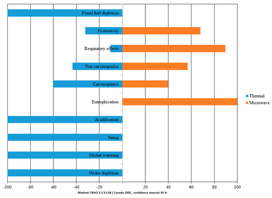 When reviewing the results of the other comparisons, the trend of the data showed that, for the majority of the time, the differences shown in the LCIA are consistent and not greatly affected by the uncertainty, even if the magnitude of that difference is small. To examine this further, one additional comparison is presented here. The thermal reclamation and microwave reclamation processes generally performed the best and were often close in magnitude. Figure 6 shows this uncertainty comparison.