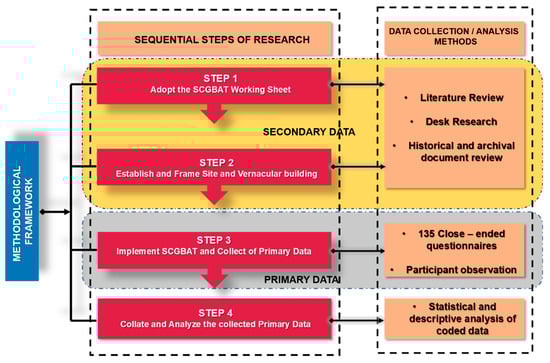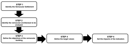 Having framed the site and the vernacular buildings, the implementation of the “SCGBAT” indicators begins. Each of the indicators is used to measure and monitor the objectives of the vernacular building as shown in the steps illustrated in Figure 2.