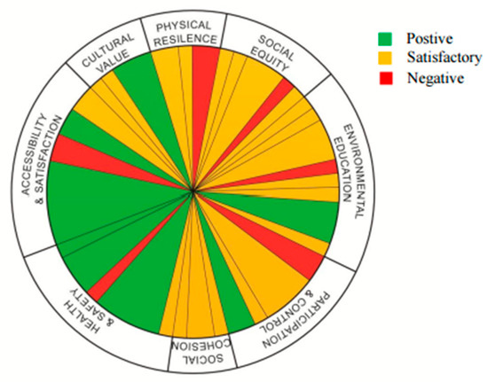 The Figure 4 above gives an overall presentation of the indicators from the SCGBAT indicators adopted. Each section of color represents the 36 indicators derived from the experts’ response to the questions are evaluation. It shows the different levels of rating in each indicator with some indicators have a mix of higher individual indicators points than the others. This shows that a single indicator can have a positive response in all its indicators while some can have a variance of negative, average and positive ratings.