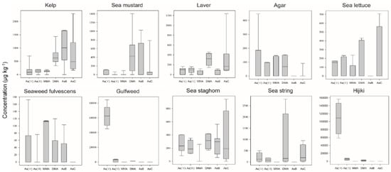 Boxplots of the distribution of 6 arsenic species in each seaweed species. Distribution of six arsenic species in kelp (n = 32), sea mustard (n = 25), laver (n = 25), agar (n = 20), sea lettuce (n = 20), seaweed fulvescens (n = 17), gulfweed (n = 12), sea staghorn (n = 13), sea string (n = 8), and hijiki (n = 8).