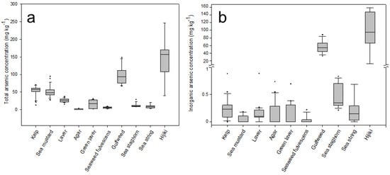 - Taylor, V.F.; Jackson, B.P. Concentrations and speciation of arsenic in New England seaweed species harvested for food and agriculture. Chemosphere 2016, 163, 6–13. [Google Scholar] [CrossRef]