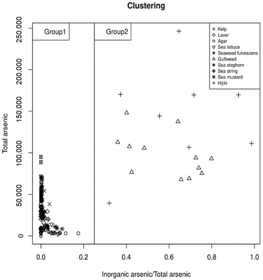 Because arsenic species concentrations appeared to differ by seaweed category, statistical clustering analysis was performed to group categories with similar appearance patterns (Figure 3). The k-means clustering analysis was performed using the tAs concentrations and iAs to tAs ratios of each sample as factors. As a result, hijiki and gulfweed, which were both characterized by high iAs:tAs ratios, were grouped together, and the other 8 seaweed categories comprised a second group. Hijiki and gulfweed also showed higher overall iAs concentrations compared to other seaweeds analyzed.