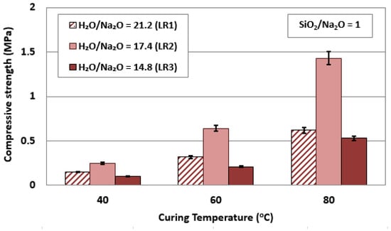 Effect of SiO2/Na2O molar ratios in relation to the corresponding H2O/Na2O molar ratios in the activating solution on the compressive strength of LR90MK10 AAMs (pre-curing time, 4 h; curing temperature, 80 °C; curing period, 24 h; ageing period, 7 days; error bars denote standard deviation of measurements obtained from three specimens).