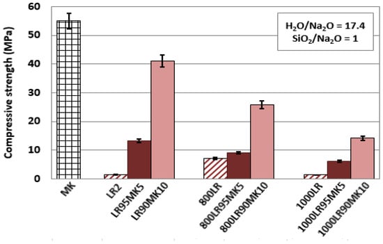 Effect of calcination temperature and addition of MK (5 wt% and 10 wt%) to LR on the compressive strength of the produced AAMs (pre-curing time, 4 h; curing temperature, 80 °C; curing period, 24 h; ageing period, 7 days; error bars denote standard deviation of measurements obtained from three specimens).