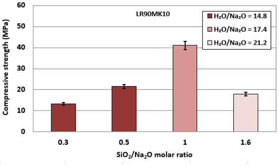 The effect of SiO2/Na2O molar ratio in relation to the corresponding H2O/Na2O molar ratios in the alkali activating solution on the compressive strength of LR90MK10 AAM are shown in Figure 3. The H2O/Na2O ratios shown in this figure are the optimum ones for each case examined. The use of a starting mixture containing 90 wt% laterite leaching residue and 10 wt% metakaolin was selected because the respective AAM acquired the highest compressive strength (41 MPa), as shown in Figure 2.