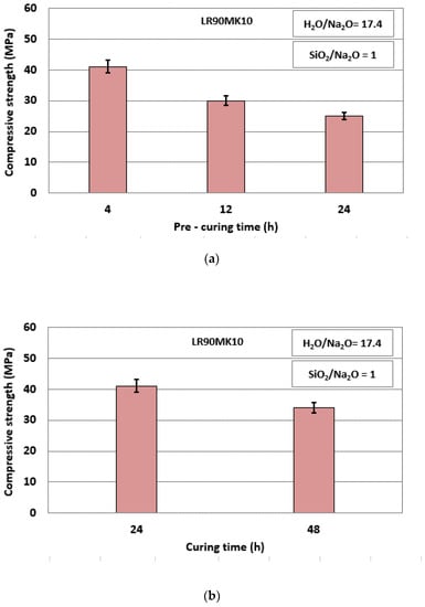 Figure 4a,b shows the effect of pre-curing (4 to 24 h) and curing time (24 to 48 h) on the compressive strength of LR90MK10 AAM, respectively.