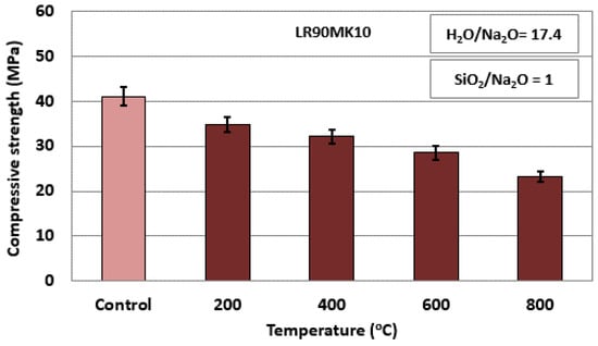 Figure 5 presents the evolution of the compressive strength of LR90MK10 AAMs after firing. The compressive strength of the control specimen, which was not subjected to firing, is also shown for comparison. It is seen from this data that the compressive strength decreases gradually with the increase of firing temperature and finally drops to 23.1 MPa at 800 °C, which is considered sufficient for the use of these AAMs as fire resistant materials. It is mentioned for comparison that thermal-stressing (from ambient temperature to 1000 °C) results in a reduction of the unconfined compressive strength (UCS) of high-strength concrete by 96%, from about 110 MPa to about 5 MPa [].
