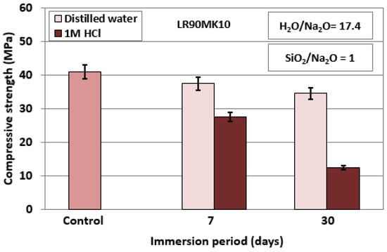 Compressive strength of LR90MK10 AAMs after immersion in distilled water and 1 mol L−1 HCl for 7 and 30 days; synthesis conditions: pre-curing time, 4 h; curing period, 24 h; curing temperature, 80 °C; ageing period, 7 days; error bars indicate the standard deviation of measurements obtained from three specimens.