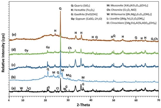 The XRD patterns of laterite leaching residues and selected AAMs are shown in Figure 7. It is observed that the main mineralogical phases present in the leaching residues are quartz (SiO2) and hematite (Fe2O3), while other minor phases are goethite (FeO(OH)), clinochlore ((Mg,Fe)5Al(Si3Al)O10(OH)8), and lizardite ((Mg,Fe) 3Si2O5(OH)4) (Figure 7a). The main Ni-bearing phases detected in the leaching residues are chromite (Cr2O3 NiO) and willemseite ((Ni,Mg)3Si4O10(OH)2). As a result of the acid column leaching of limonitic laterite (CaO content, 3.7 wt%; Table 1) with the use H2SO4 solution, gypsum was also detected in the residues. On the other hand, the main mineralogical phases present in the XRD pattern of metakaolin are quartz and muscovite with a broad amorphous hump seen between 17° and 40° 2-Theta (Figure 7b).
