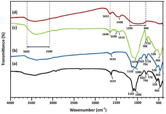 FTIR spectra of (a) laterite leaching residues and AAMs produced using (b) only leaching residues (LR2 AAM) as well as by mixing (c) leaching residues and metakaolin at mass ratio 90:10 (LR90MK10) and (d) LR90MK10 after firing at 800 °C for 2 h.