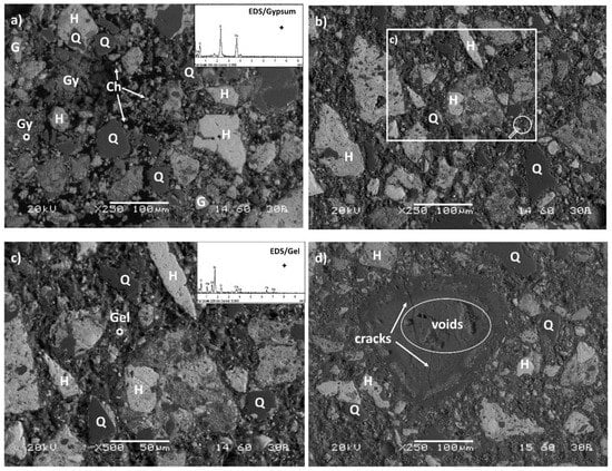 SEM-back-scattered electron (SEM-BSE) images of selected AAMs produced using (a) only laterite leaching residues (LR2 AAM) as well as by mixing (b,c) leaching residues and metakaolin at mass ratio 90:10 (LR90MK10) and (d) LR90MK10 fired at 800 °C. Energy dispersive X–ray spectroscopy (EDS) spectra show in several spot locations the presence of crystalline phases, the formation of mixed aggregates, and newly formed products (Q: Quartz, H: Hematite, G: Goethite, Gy: Gypsum, Ch: Chromite, Gel: (N,C)–A–S–H gel ).