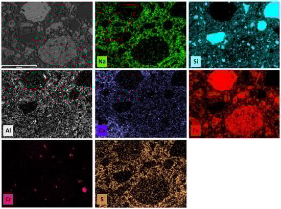 The microstructure of the LR90MK10 AAM was further evaluated using EDS elemental mapping analysis in order to elucidate the alkali activation mechanisms and the subsequent formation of reaction products in the polymeric matrix (Figure 10). The results of elemental mapping show a quite homogenous distribution of the main elements Ca, Fe, Al, Si, S, and Na throughout the polymeric matrix, thus suggesting the formation of strong bonds due to reactions between leaching residues, metakaolin, and alkaline activators (NaOH and Na2SiO3 solutions). In this context, the elemental maps of Al, Ca, and S indicate that the high Al content of metakaolin (40.3% as oxide) as well as gypsum formed during the column acid leaching of the limonitic laterite with the use of H2SO4 were evenly distributed in the formed gel. The uniform distribution of gypsum inside the polymeric network indicates the synergistic interaction with the metakaolin added in the starting mixture, which results in the production of specimens with beneficial mechanical properties []. However, and in line with the XRD results, elemental mapping shows that some unreacted particles of quartz, hematite, and chromite are still present (bright spot areas) in the produced AAMs. It is important here to note that, despite the fact that laterite leaching residues have a relatively high content of Cr2O3 (2.5 wt%), as shown in Table 1, elemental distribution of Cr indicates that its dissolution from the raw material is extremely limited.