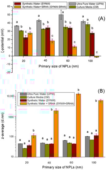 (A) ζ-Potentials and (B) z-average hydrodynamic diameters of polystyrene nanoplastics (NPLs) at a concentration of 50 mg/L as a function of primary sizes in ultra-pure water (UPW), culture media (CM), synthetic water (SYNW), and synthetic water spiked with SRHA (SYNW-SRHA) at a concentration of 1 mg/L. Letters (a,b,c) indicate statistically significant difference between treatments (pairwise multiple comparison procedures—Tukey’s test within each NPL size group, p-value < 0.05).