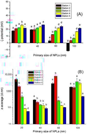 (A) ζ-Potentials and (B) z-average diameters of polystyrene nanoplastics (NPLs) as a function of primary sizes in freshwaters at marsh–lake transect “Pointe-à-la-Bise”. NPL concentration is equal to 50 mg/L, and from Station 1 to Station 5, DOC concentration is equal to 1.681, 1.515, 1.326, 1.116, and 0.8795 mg/L, respectively. Letters (a,b,c,d) indicate statistically significant difference between treatments (pairwise multiple comparison procedures—Tukey’s test within each NPL size group, p-value < 0.05).
