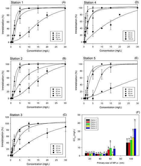 Dose–response (immobilization of D. magna) curves obtained during 48-h exposure in water from different sampling stations in marsh–lake transect (A–E). The lines represent the fit of experimental data with a four-parameter log-logistic model. Error bars represent the standard deviation when bigger than the symbol size, N = 3. (F) Acute EC50 values for D. magna, 48-h immobilization test, exposed to NPLs of different primary sizes obtained in natural water. Letters indicate statistically significant difference between treatments (pairwise multiple comparison procedures—Tukey’s test within each NPL size group, p-value < 0.05).