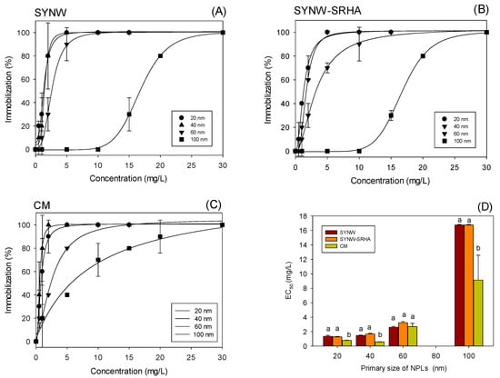 Immobilization of D. magna as a function of NPL concentration obtained in (A) synthetic medium, (B) synthetic medium with 1 mg/L SRHA added, and (C) D. magna culture medium. The lines represent the fit of experimental data with a four-parameter log-logistic model. Error bars represent the standard deviation when bigger than the symbol size, N = 3. (D) Acute EC50 values for D. magna, 48-h immobilization exposed to NPLs of different primary sizes obtained in synthetic media. The values are average ± standard deviation for triplicate experiments (N = 3). Letters indicate statistically significant difference between treatments (all pairwise multiple comparison procedures—Tukey’s test within each group, p-value < 0.05).