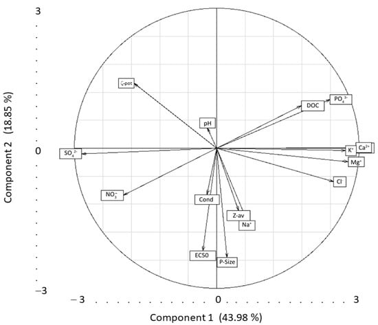 Principal component analysis (first two PCs) between EC50 obtained in 48-h immobilization test, z-average size (Z-av), ζ-potential (ζ-pot), primary size (P-Size) of NPLs and different physicochemical characteristics of the exposure media: DOC (dissolved organic carbon), pH, conductivity (Cond), ionic composition, Na+, K+, Ca2+, Cl−, NO3−, SO42−, PO43−.