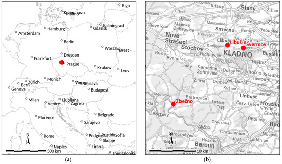 The location of the area of interest: (a) Position within Central Europe; (b) Sampling site locations. Topography base: (a) Made with Natural Earth. Free vector and raster map data at naturalearthdata.com; (b) ČÚZK, State Administration of Land Surveying and Cadastre.