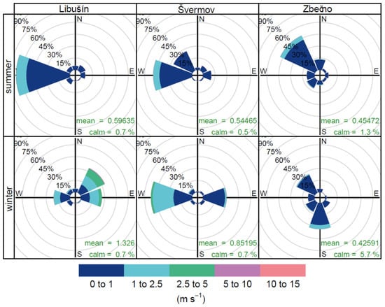The prevailing wind direction in Libušín and Švermov was almost the same. Generally, the most frequent was the west direction here. In the winter, wind flow from eastern directions was more frequent compared to the summer. At the Libušín site, east and northeast directions were the most frequent ones in the winter. In the winter, average wind speed was significantly higher at both of the mentioned sites (approximately from 0.5 to 0.6 m.s−1 in the summer and 0.9 to 1.3 m.s−1 in the winter). In contrast, the wind measurement in Zbečno shows the prevailing directions in accordance with the river canyon course (northwest and south are the most frequent). A lower average wind speed and its negligible difference between seasons was observed here (approximately 0.5 and 0.4 m.s−1 in the summer and winter). The lower wind speed and more frequent calm in Zbečno (1.3 and 5.7% in the summer and winter, respectively) compared to Libušín and Švermov (0.5–0.7% in the summer and 0.7% in the winter) prove the limited local air mixing conditions.