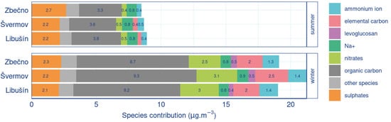 Similarly to Figure 3, Table 2 proves the relatively small differences between PM2.5, benzo[a]pyrene, and arsenic concentrations among the monitoring sites. In contrast, strong seasonal variation of their concentrations has been observed, especially in the case of benzo[a]pyrene (differences of two orders of magnitude). The majority of the species showed nearly lognormal distribution. Based on the comparison of the mean and median values, Table 2 highlights the significant influence of outliers in Zbečno on the average arsenic and benzo[a]pyrene concentrations in the winter.