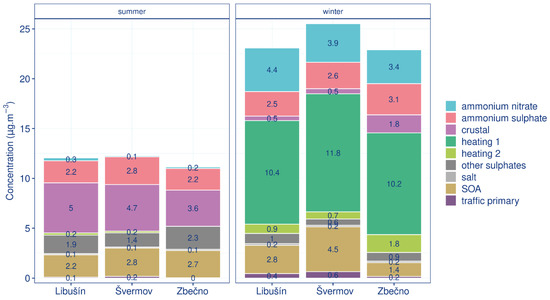 The crustal factor had a significant contribution during the summer and low contribution during the winter. An exception is the situation at the monitoring site in Zbečno. There were several peak contributions here in the winter, probably due to the presence of a nearby all-year operating quarry (resuspension from the quarry area, from local roads used for stone transportation, and from the loading space of trucks). As opposed to the quarry impact in Zbečno, the crustal contribution in Libušín and Švermov is caused by resuspension from the paved city surfaces in the dry season. The crustal factor contribution was about 15% at all the monitoring sites.