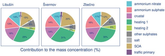Regarding the PM2.5 mass concentration, residential heating was the most important air pollution factor in the area of interest. Despite the fact that heating is of relevance only in the cold part of the year, it still represented the highest contribution to the annual PM2.5 concentration. The sum of the two identified heating factors accounts for approximately one third of the total PM2.5 concentrations. While the heating 1 factor had similar average contribution and variation at all the monitoring sites, there were significant differences in the case of the heating 2 factor. The contribution of the arsenic-rich heating 2 factor to PM2.5 concentrations was about two times higher in Zbečno than in Libušín and Švermov. The presence of arsenic and sulfur dioxide in the heating 2 factor chemical profile (see Appendix A) points to burning coal of low quality in Zbečno (with a high share of lignite, as it has high sulfur content [18] and high arsenic content of lignite mined in specific Czech regions [19]).