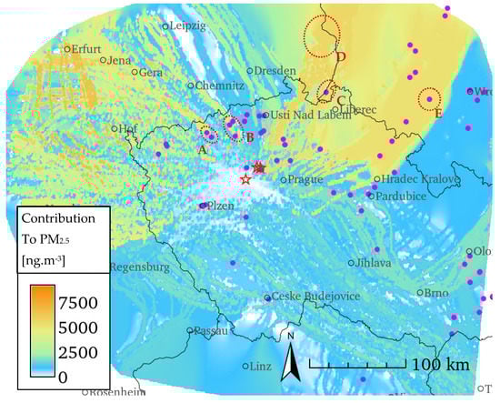 The other sulfates” PMF factor was hard to explain without further analysis. Therefore, hourly back trajectories covering the whole sampling period were batch-processed. Back trajectories based on the hourly meteorological data were used, while the aerosol sampling was made with a sampling duration of 12 h. Therefore, 12 trajectories were assigned to each of the samples. The contribution of the other sulfates factor to the PM2.5 concentration was then assigned to each of such 12 back trajectories. Subsequently, all the trajectories with the assigned factor contribution were converted to raster layers and overlaid in GRASS GIS. (For overlapping trajectories, the factor contributions assigned to the individual trajectories were averaged out.) Trajectories with a high factor contribution to PM2.5 were visually accentuated by the nearest neighbor method using a 90th percentile in the moving window. The analysis result is shown in Figure 7. Violet points in Figure 7 represent positions of large combustion plants (LCPs) with sulfur oxides emissions exceeding 100 tons per year. The analysis is based on The European Pollutant Release and Transfer Register (E-PRTR) data of the year 2019 [21]. Unfortunately, information about locations and emissions of German LCPs were not published in The European Pollutant Release and Transfer Register, so they are not shown in Figure 7. Nevertheless, the graphical analysis result indicates that a significant part of the other sulfates factor contribution to PM2.5 is related to LCPs operation. (See red-marked areas in Figure 7).