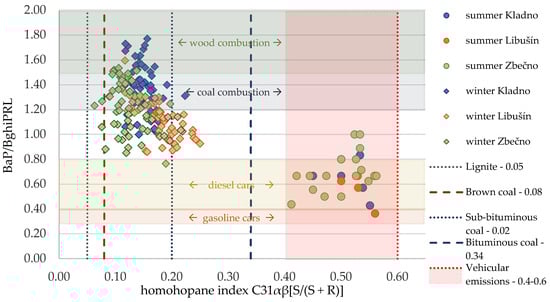 Cross plot for the ratio of BaP/BghiPRL to homohopane index C31αβ[S/(S + R)]. The different symbols and colors identify measurements performed during the winter (diamonds) and summer (circles) at the three sampling sites (blue—Švermov, orange—Libušín, green—Zbečno).