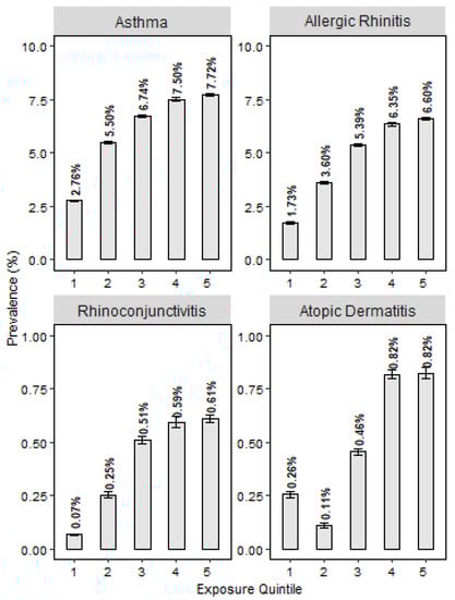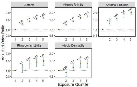 - To, T.; Zhu, J.; Stieb, D.; Gray, N.; Fong, I.; Pinault, L.; Jerrett, M.; Robichaud, A.; Ménard, R.; van Donkelaar, A.; et al. Early life exposure to air pollution and incidence of childhood asthma, allergic rhinitis and eczema. Eur. Respir. J. 2020, 55, 1900913. [Google Scholar] [CrossRef]