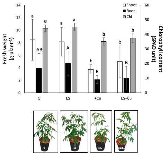 Fresh weight of shoots (white bars) and roots (black bars), and chlorophyll (Chl) content (grey bars) of hemp plants grown hydroponically in four different growth conditions: control (C = 1.2 mM sulfate and 0.2 μM CuSO4); sulfate treatment (ES = 2.4 mM sulfate and 0.2 μM CuSO4); excess Cu (+Cu = 1.2 mM sulfate and 20 μM CuSO4); excess Cu and sulfate treatment (ES+Cu = 2.4 mM sulfate and 20 μM CuSO4). Below graph, pictures of 21-day-old hemp plants exposed to the four different growth conditions. Data are reported as mean ± SD of three independent replicates (n = 3). The statistical significance was determined by one-way ANOVA analysis with LSD post hoc test (p < 0.05). Different lower-case, upper-case, and bold lower-case letters indicate significantly different values among the fresh weights in shoots and roots, and Chl content, respectively.