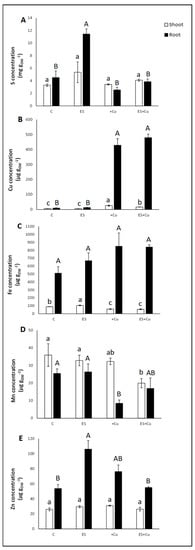 Most remarkably, a significant increase in both Fe (Figure 2C) and Zn (Figure 2E) accumulation was found in ES shoots and roots, respectively, confirming other recent studies where the S benefits for Fe and Zn accumulation in durum wheat plants have been demonstrated [34]. The enhancement of Fe accumulation in plants exposed to high S supply could originate from a response mechanism based on an increased availability of S-containing metabolites, which are precursors for the synthesis of nicotianamine, ethylene, and phytosiderophores playing a key role in the improvement of Fe uptake activity [51,52].