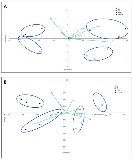 Results for shoots are reported in Figure 3A, where the first two components, used to build the scatter plot, represented 78.62% of the total variance. The four different growth conditions (C, ES, +Cu, and ES + Cu) clustered in four distinct groups (Figure 3A). Along the first component (PC1), representing 52.52% of the total variance, the groups were distinguished according to the sulfate supply in the NS (i.e., +Cu vs. ES + Cu and C vs. ES). Along the second component (PC2), representing 26.10% of the total variance, the groups were distinguished in function of the Cu concentration in the NS (i.e., +Cu vs. C and ES + Cu vs. ES) (Figure 3A). Considering PC1, the positive contribution to the separation was given mostly by P (Figure S1). Only Mg and S concentrations contributed negatively to the separation along PC1 (Figure S1). Considering PC2, mainly Mg drove the distribution along the positive direction of the axis, while only P and Cu concentrations were the drivers for the negative direction of the axis (Figure S2).