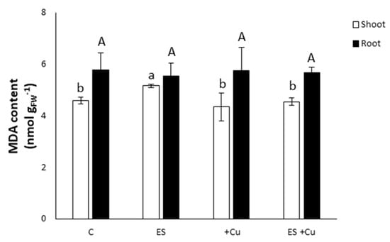 Malondialdehyde is one of the most common biomarkers of lipid peroxidation, an oxidative damage affecting the functionality of cell membranes. Figure 4 shows that the MDA content in shoots and roots was not significantly influenced neither by the Cu toxicity nor by the sulfate availability in the NS, except for shoots from plants exposed to ES condition, where this parameter was increased by 13% compared to the control shoots (Figure 4).