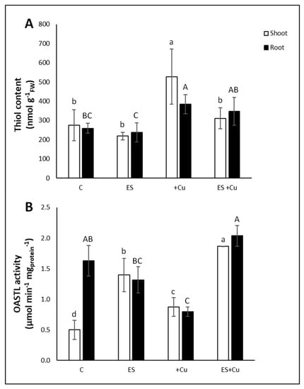 In shoots, OASTL activity was stimulated in all the three different growth conditions in the following order: ES + Cu condition (+274%) > ES condition (+180%) > +Cu condition (+75%), compared to C condition (Figure 5B). On the other hand, OASTL activity in roots of plants from both ES and ES + Cu conditions was consistently similar to that of control roots, whereas in +Cu roots it was significantly decreased (−51%) (Figure 5B).