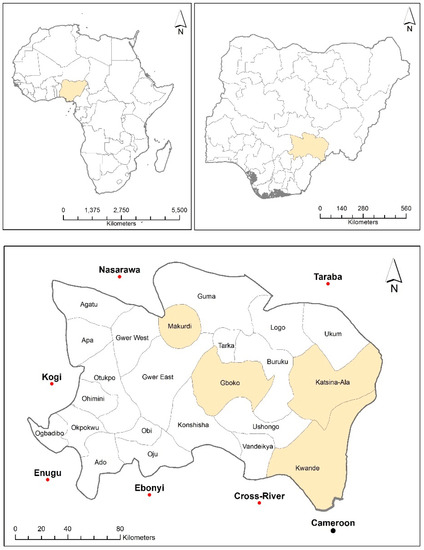 Benue state, Nigeria, Africa (Figure 1) is noted as a “food basket” state as it can produce virtually all major food crops of the nation, such as rice (Oryza sativa), cassava (Manihot esculenta), yam (Dioscorea spp.), maize (Zea mays), sweet potato (Lopmoea batata), groundnut (Arachis hypogaea), sorghum (Sorghum bicolor), and cowpea (Vigna unguiculata) as well as tree crops such as oil palm (Elaeis guineensis), orange (Citrus sinensis), mango (Mangifera indica), and cashew (Anacardium occidentale) [30]. We purposely selected the state because agriculture is the major source of livelihood for over 70% of its 4.25 million population [30]. However, the prolonged incidence of farmer-herder conflict has made Benue a center of resource-based conflict in Nigeria [31]. We wished, therefore, to understand the connection of this conflict in the context of ongoing ALUC.