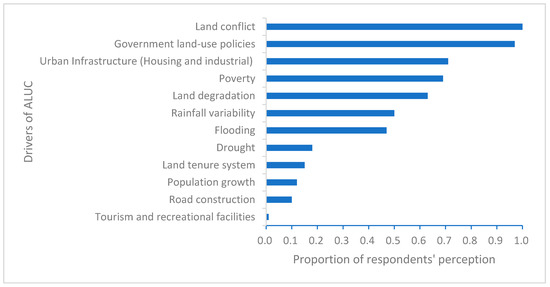 The majority of the farmers perceived that ALUC occurred in the last five years, and the bulk of this change has been a decrease in the area of agricultural land use (Table 2). Farmers identified 12 underlying factors driving ALUC (Figure 2). All the respondents agreed that land-use conflict is the main factor driving ALUC in Benue State. Other significant factors are government-land use policies such as open grazing policy, urban infrastructure, and poverty resulting from lack of alternative sources of livelihoods.