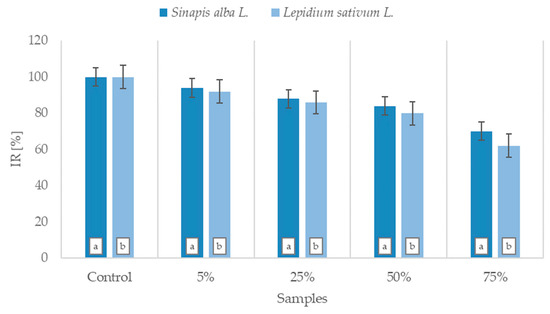 The values of IR of Sinapis alba L. and Lepidium sativum L. ranged from 62% to 94%; standard ČSN EN 13432 defines the value of germinated seeds/growing plants below 90% (compared with the values of control sample without the tyre abrasion products) as phytotoxic [25]. Baran and Tarnawski [27] classified growth inhibition values of germinated seed/growing plants below 90% as inhibiting, from 90% to 110% as having no effect (non-phytotoxic) and above 110% as growth stimulating [27]. The germination capacity classified as non-phytotoxic (with no effect) was demonstrated in substrates with 5% of tyre abrasion products both in the growth of Sinapis alba L. (IR = 94%) and in Lepidium sativum L. (IR = 92%). Lepidium sativum L. is more sensitive to the presence of toxic substances and responded more sensitively to tyre abrasion products, with the number of germinated seeds/growing plants being lower in units than in Sinapis alba L. The other substrates with higher shares of abrasion products (25%, 50% and 75%) exhibited the values of germinated seeds/growing plants below 90% and were marked as phytotoxic.