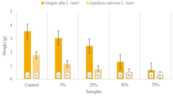 Weight of wet biomass of Lepidium sativum L. and Sinapis alba L.