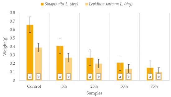 Weight of dry biomass of Lepidium sativum L. and Sinapis alba L.