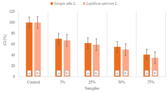 Values of GI decreased with increasing shares of tyre abrasion products. The lowest level of phytotoxicity was recorded in the sample with the 5% share of abrasion products tested on Sinapis alba L. (GI = 70%). At the same time, this share of 5% was non-phytotoxic (66 < GI (%) < 100). In contrast, the highest level of phytotoxicity was recorded in the sample with 75% of abrasion products tested on Lepidium sativum L. (GI = 35%). Lepidium sativum L. reacted again more sensitively to higher shares of tyre abrasion products, with the percentage of phytotoxicity (GI) being higher in units than in Sinapis alba L. The biological tests demonstrated phytotoxicity of tyre abrasion products from their share of 25% in the extract.