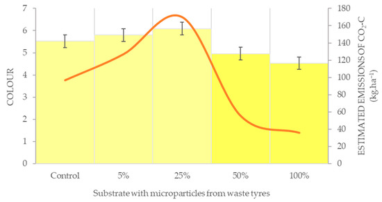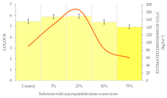 Figure 6 represents a curve of soil biological activity—respiration in the test glass (Solvita) for 24 h for substrate with the predetermined shares of tyre abrasion products. The highest biological activity and, simultaneously, the highest CO2 emissions released from the soil were recorded in the substrates with 5% and 25% tyre abrasion products. The lowest biological activity and, simultaneously, the lowest CO2 emissions were recorded in the substrate with 50% and 75% tyre abrasion products.