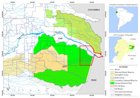 Since the 1970s, Ecuador’s production model has been based on oil extraction, this has caused harmful situations such as the destruction of the jungle and the disappearance of indigenous communities or isolated peoples [54]. Work on the ITT Oil Block began more than 90 years ago by the company “Leonard Exploration Co.”, which received its first concession to explore hydrocarbons in the Amazon region in 1921 in an area of 2,000,000 ha. In 1937, the “Anglo” company received a concession to explore the Amazon region, and in 1938, 10,000,000 ha of the ARE was granted to the “Shell” company, which in 1970, drilled the Tiputini 1 well in the north of the ITT that presented traces of heavy oil from the 11th API (American Petroleum Institute). This occurred in the Tena Basal and M1 formation that was later abandoned on the southern side of the Napo River in a higher structure and with positive results [55]. In 1990, the limits of the YNP were modified to legalize 612,000 ha of lands in favor of the indigenous Waorani people and since then oil concessions in protected areas have been prohibited [56].